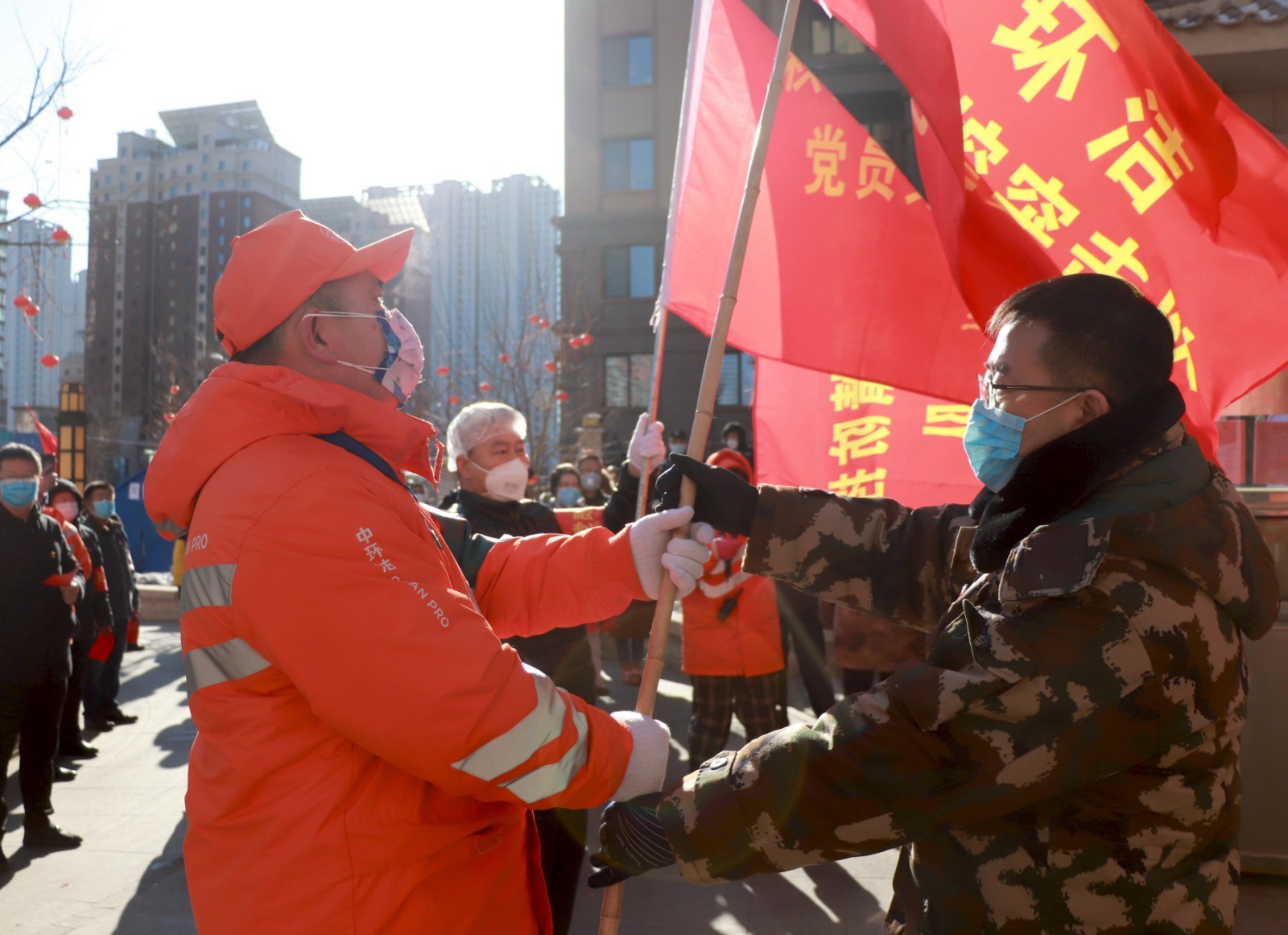呼和浩特市玉泉區昭君路街道秋實璟峯匯小區出現1例確診病例后,為有效遏制疫情繼續擴散,2月4日上午,秋實璟峯匯成立疫情防控臨時黨支部和2支疫情防控突擊隊,同時對突擊隊進行授旗。