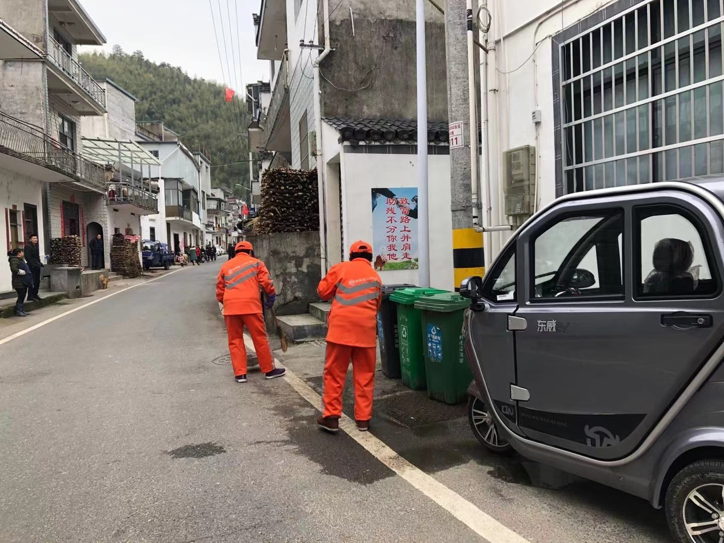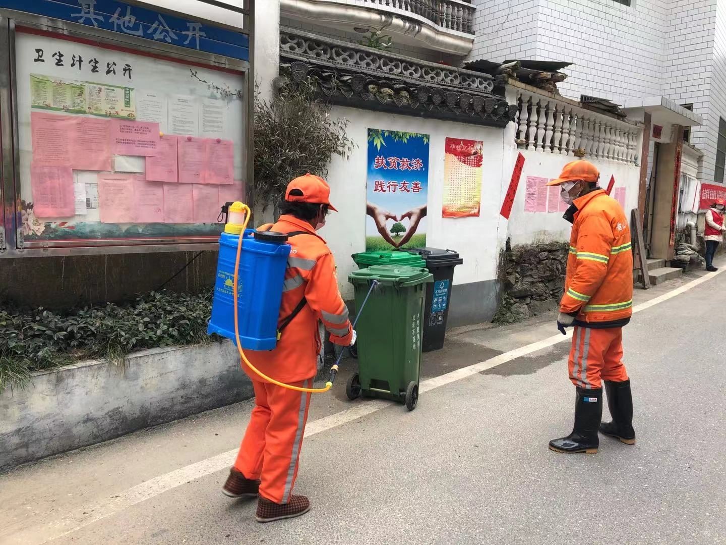歙縣北岸鎮副鎮長李玉龍告訴記者,該鎮每個村有專門保潔員,配發了噴霧器、84消毒液,配備廢棄口罩專用垃圾桶,中環潔的員工不僅要清理好生活垃圾,還定期對公共場所全面消毒。同時,鄉里也發動廣大黨員和志愿者巡邏宣傳,呼吁村民注意環境衛生,盡量待在家里,不要外出。