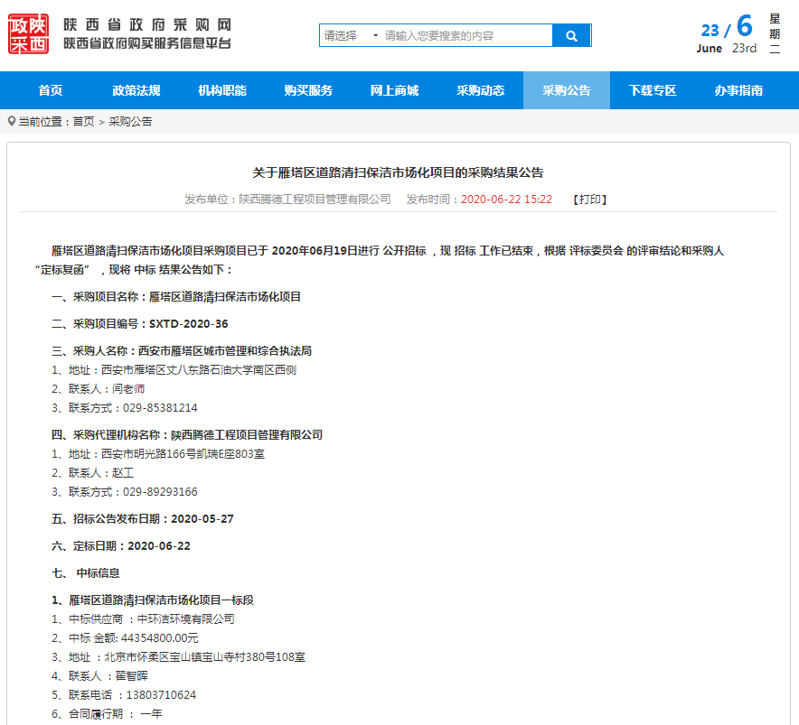近日,中環(huán)潔中標西安市雁塔區(qū)道路清掃保潔市場化項目一標段。項目中標金額4435.5萬元,服務年限1年,服務范圍包含雁塔、等駕坡和曲江轄區(qū)城市道路,保潔總面積153.73萬㎡,綠化面積12.59萬㎡。服務內(nèi)容分為道路人工清掃保潔部分,含道路清掃、綠化帶清掏撿拾、果皮箱(垃圾桶)及滅煙柱清掏擦洗、野廣告清理、道班房、保潔工具箱及休閑座椅等其他城市家具清潔;機械化作業(yè);道路掃雪除冰;極端天氣等環(huán)境衛(wèi)生應急整治及采購人要求的其他工作。